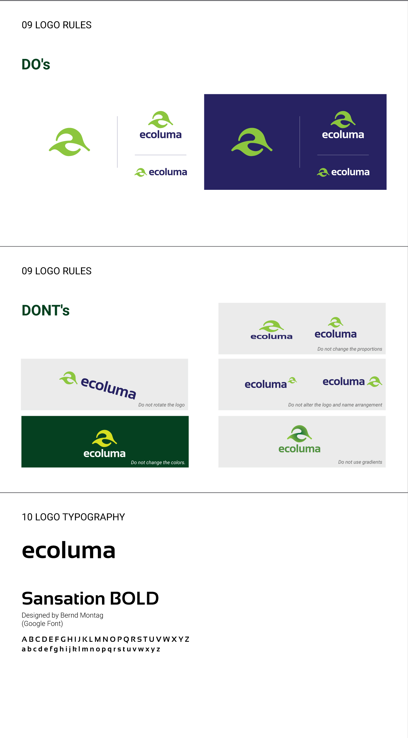 Rounded, fluid lines with a subtle leaf-like touch create a fusion of nature and technology, highlighting the brand’s eco-friendly approach. The lowercase sans-serif typography adds a friendly, contemporary feel, reinforcing ECOLUMA’s reliable and accessible character. The green color symbolizes ecology and sustainability, while navy blue/indigo provides a refined contrast, emphasizing the brand’s modern and innovative spirit.